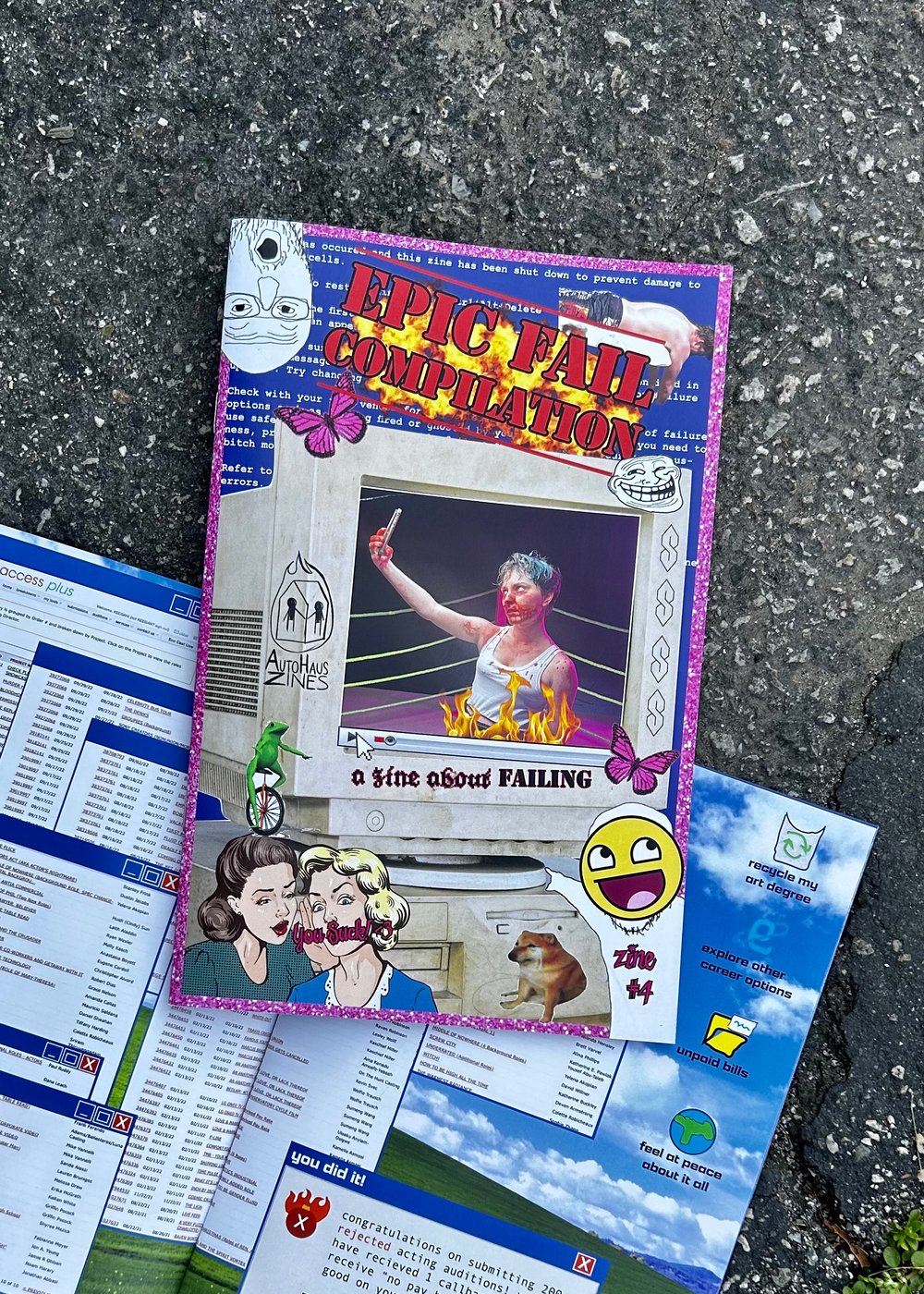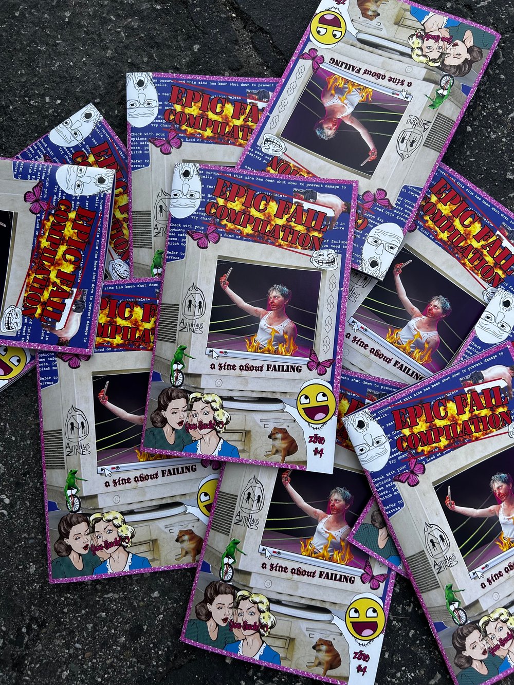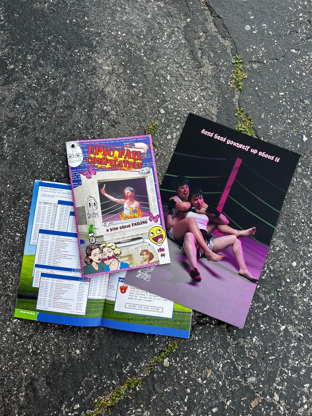 This epic, cringe, dated, internet brain-rot, accident riddled zine is about learning to take an L and keep going---or owning the power give up! This is a space to collectively mourn for all the times we didn't succeed and remember that we all fail, even in a world where we only see the best most curated moments in each other's lives. From DUIs, to failing law school, to bad haircuts, to being ghosted, to feeling passive aggressive when someone tells you "dont give up!" --- I've got it all in this zine.
